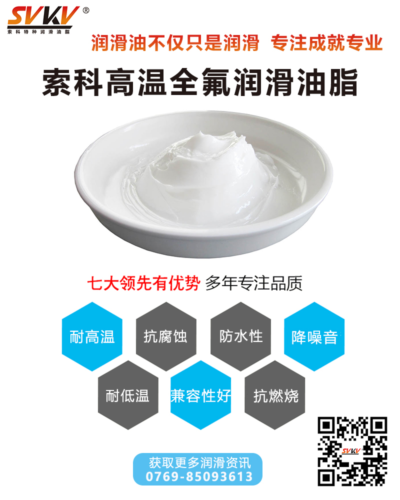 索科SVKV高溫全氟潤滑油脂是由聚四氟乙烯(PTFE)并添加特種抗腐蝕添加劑精制而成的白色全氟聚醚潤滑脂,專用于高溫、高負載、化學腐蝕環境中的軸承、齒輪、頂針以及要求終生潤滑的部件,抗氧化、低揮發、不結焦、不積碳、抗腐蝕耐磨損、抗擠壓性好,特別是在極度高溫和惡劣環境下的使用。一般可使產品壽命延長10—60倍。